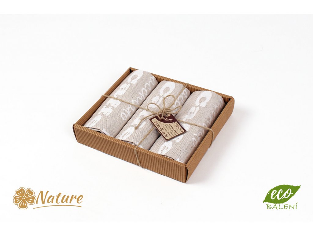Dárkové balení našich žakársky tkaných utěrek, udělá radost vašim milým či budou praktickým dárkem obchodnímu partnerovi. Pevná krabička z vlnitého papíru v kombinaci s lněným provázkem a štítkem českého výrobce, dává vašemu dárku pocit luxusního eko - českého produktu.
