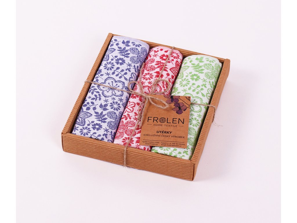 Balení obsahuje 3ks kvalitní žakársky tkané utěrky. Jsme tkalcovna s vlastní šicí dílnou, balením a expedicí, proto nás neváhejte kontaktovat s požadavkem na jiné balení. Viz. položka vlastní dárkové balení v naší nabídce.